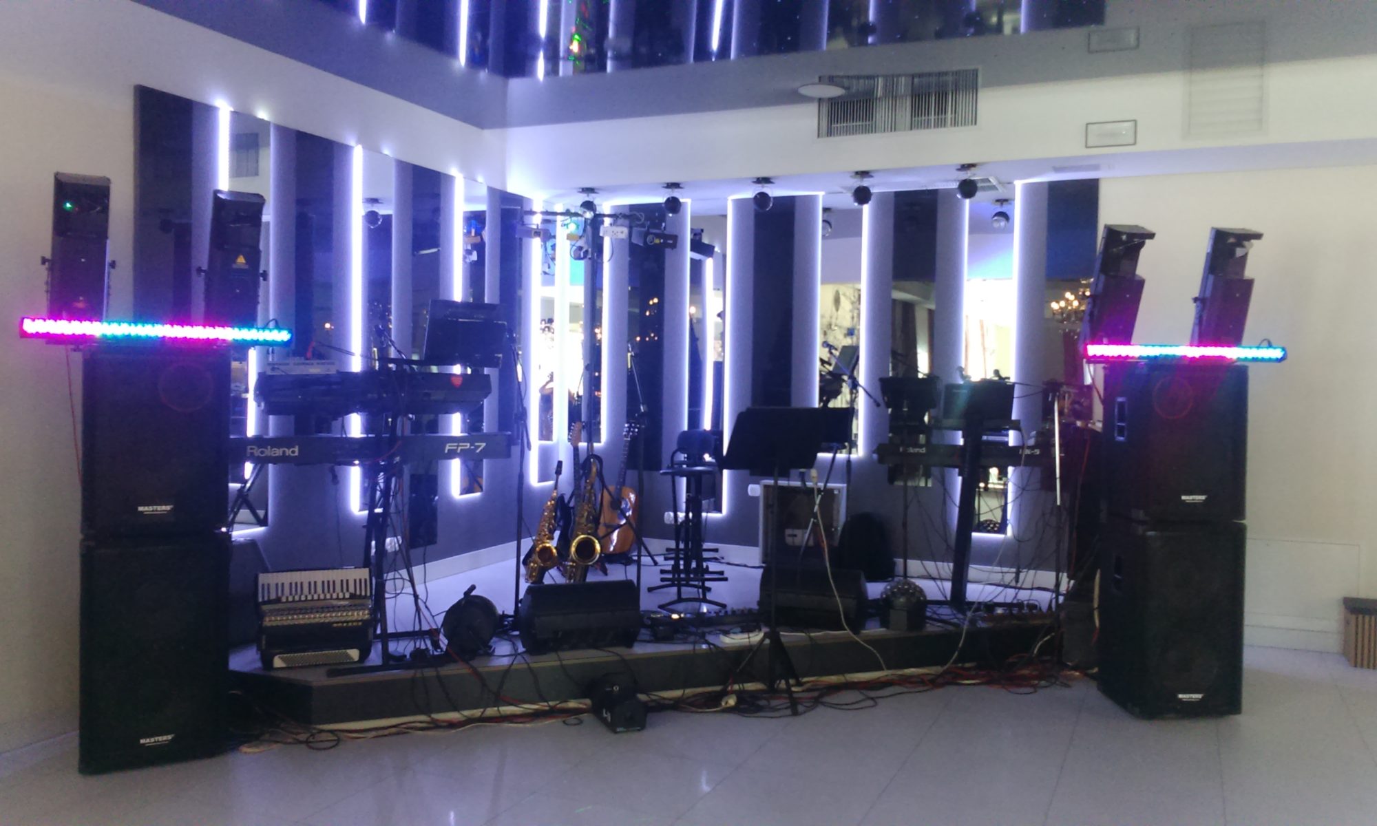 Posiadamy własne profesjonalne nagłośnienie, oświetlenie sceniczne (głowy ruchome, lasery, wytwornicę lekkiego dymu).